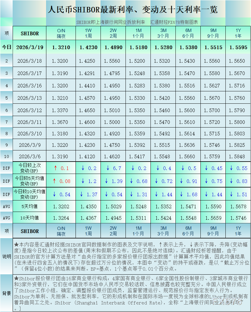 汇通财经APP讯——人民币SHIBOR(上海银行间同业拆放利率):2026年3月19日最新数据,7个周期利率下降,1个周期利率上升,其中,隔夜Shibor报1.321%,升0.1个基点。各周期“变动幅度最大”的是人民币SHIBOR的2周利率:降6.7个基点。(最近十个工作日SHIBOR及变动详见汇通FX678特制图);其他周期显示,1周Shibor报1.423%,降0.2个基点。2周Shibor报1.489%,降6.7个基点。1个月Shibor报1.518%,降0.2个基点。3个月Shibor报1.528%,降0.4个基点。6个月Shibor报1.538%,降0.5个基点。9个月Shibor报1.5515%,降0.45个基点。一年Shibor报1.5595%,降0.55个基点。