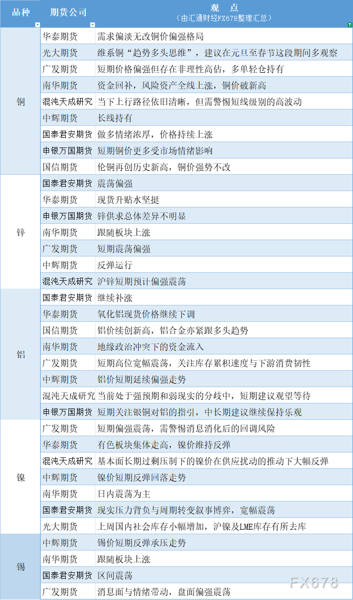 期货公司观点汇总一张图:1月6日有色系(铜、锌、铝、镍、锡等)