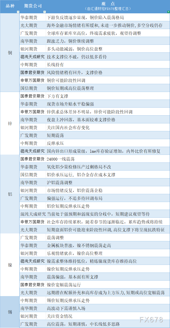 期货公司观点汇总一张图:1月21日有色系(铜、锌、铝、镍、锡等)