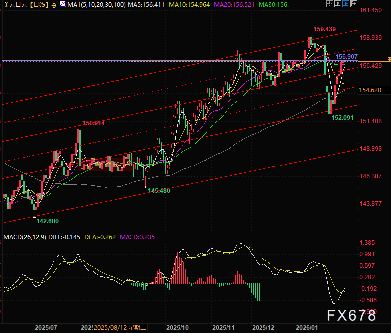 周五(2月6日)亚市时段,日元吸引部分买家入场,目前似乎已止住连续五个交易日美元兑日元的涨势,此前一天美元兑日元曾触及两周高点(157.33),美元兑日元现交投于156.60附近,日内跌幅约0.25%。交易员们对日美可能联合干预以阻止日元贬值的迹象保持高度警惕,提振了日元的避险属性。然而技术面日元看跌压力仍存。