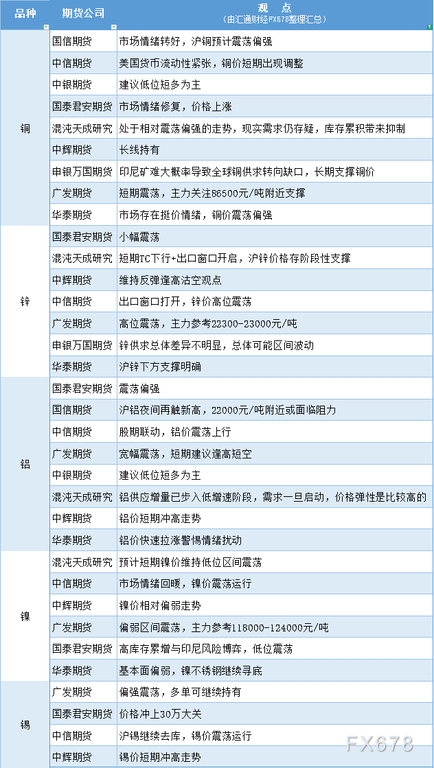 期货公司观点汇总一张图:11月13日有色系(铜、锌、铝、镍、锡等)